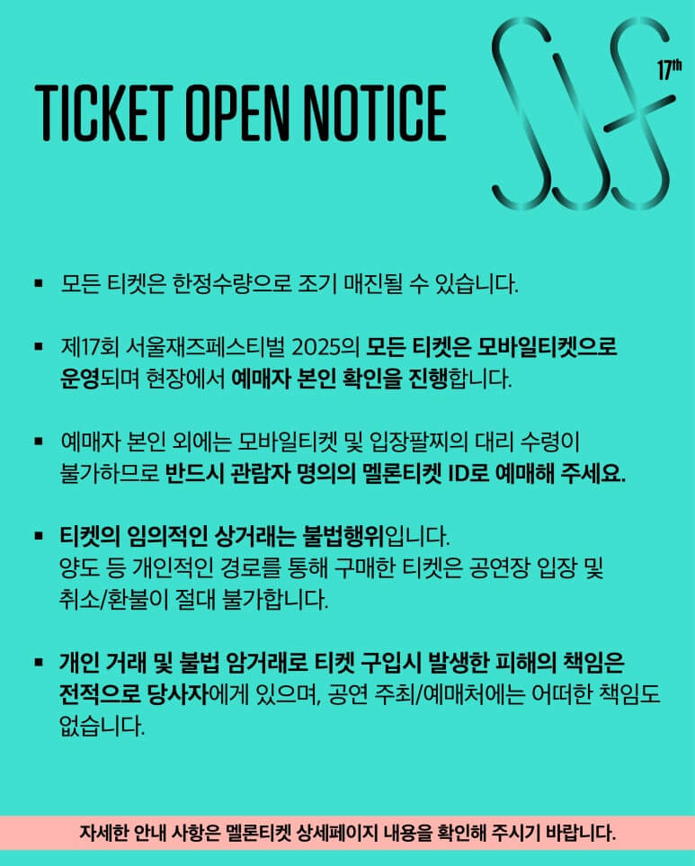 실패 시 대처법: 티켓 오픈은 1차만 진행되지만, 간혹 취소표가 풀리는 경우가 있습니다. 서울재즈페스티벌 공식 SNS를 팔로우하고 취소표 소식을 주시하세요. 또한 멜론티켓의 공식 양도 서비스를 통해 구매 기회가 생길 수도 있습니다.